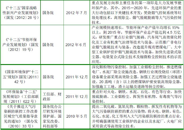 我國(guó)政府將環(huán)境保護(hù)確立為我國(guó)的一項(xiàng)基本國(guó)策,近年來,國(guó)家進(jìn)一步加大環(huán)境保護(hù)力度,推進(jìn)環(huán)境保護(hù)進(jìn)程,制訂了一系列政策  、規(guī)劃,近年來國(guó)家頒布的主要產(chǎn)業(yè)政策如下:《重點(diǎn)區(qū)域大氣污染防治“十二五”規(guī)劃》(環(huán)發(fā)〔2012130 號(hào))是我國(guó)第一部綜合性大氣污染防治規(guī)劃,標(biāo)志著我國(guó)大氣污染防治工作的目標(biāo)導(dǎo)向正逐步由污染物總量控制向改善環(huán)境質(zhì)量轉(zhuǎn)變,由主要防治一次污染向既防治一次污染又注重二次污染轉(zhuǎn)變。通過實(shí)施該規(guī)劃,到2015 年,重點(diǎn)區(qū)域(涉及京津冀、長(zhǎng)三角、珠三角等19 個(gè)省、自治區(qū)、直轄市)二氧化硫、氮氧化物、工業(yè)煙粉塵排放總量分別下降12%、13%10%,可吸入顆粒物(PM10)、二氧化硫、二氧化氮、細(xì)顆粒物(PM2.5)年均濃度分別下降10%、10%7%、5%